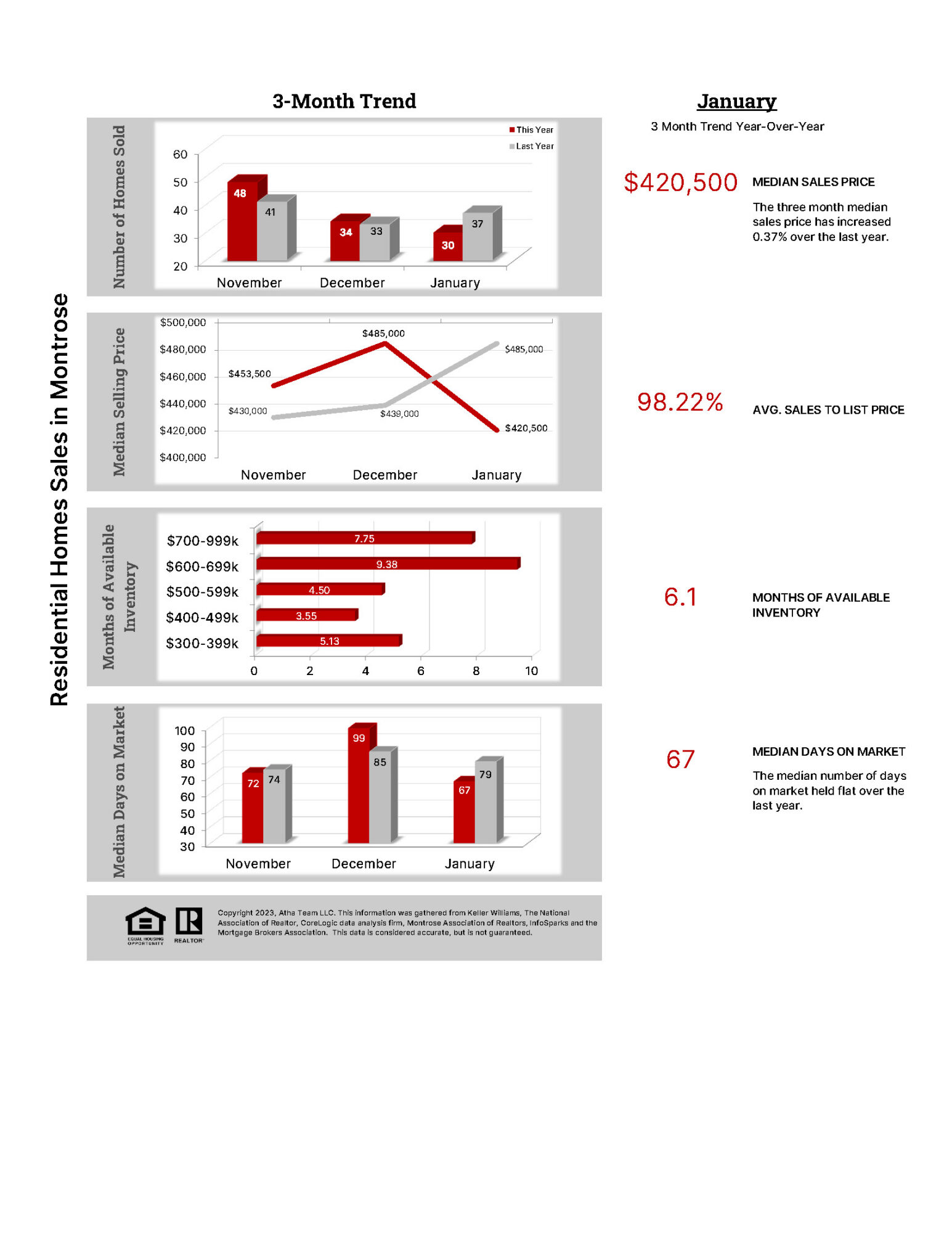 Not at the breakneck pace we became accustomed to during the COVID era, but it is moving. Average days on market dropped meaningfully from December to January, from 99 days to 67 days. Entry-level home sales led the market in January, pulling the average sales price down from $485,000 to $420,000. Inventory currently sits at 6.1 months, a level most would describe as balanced.